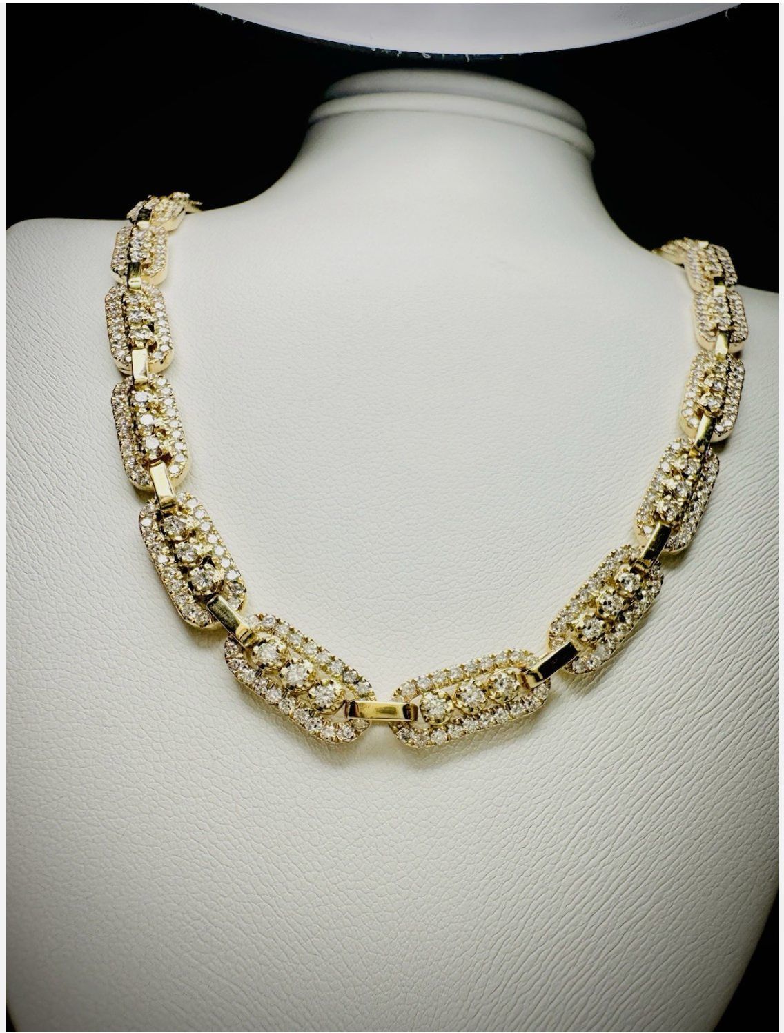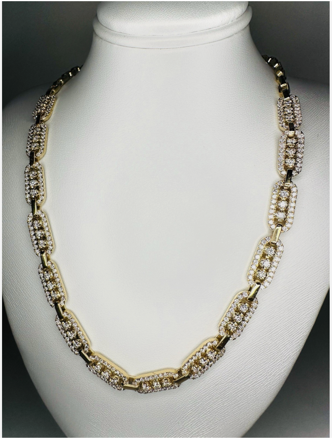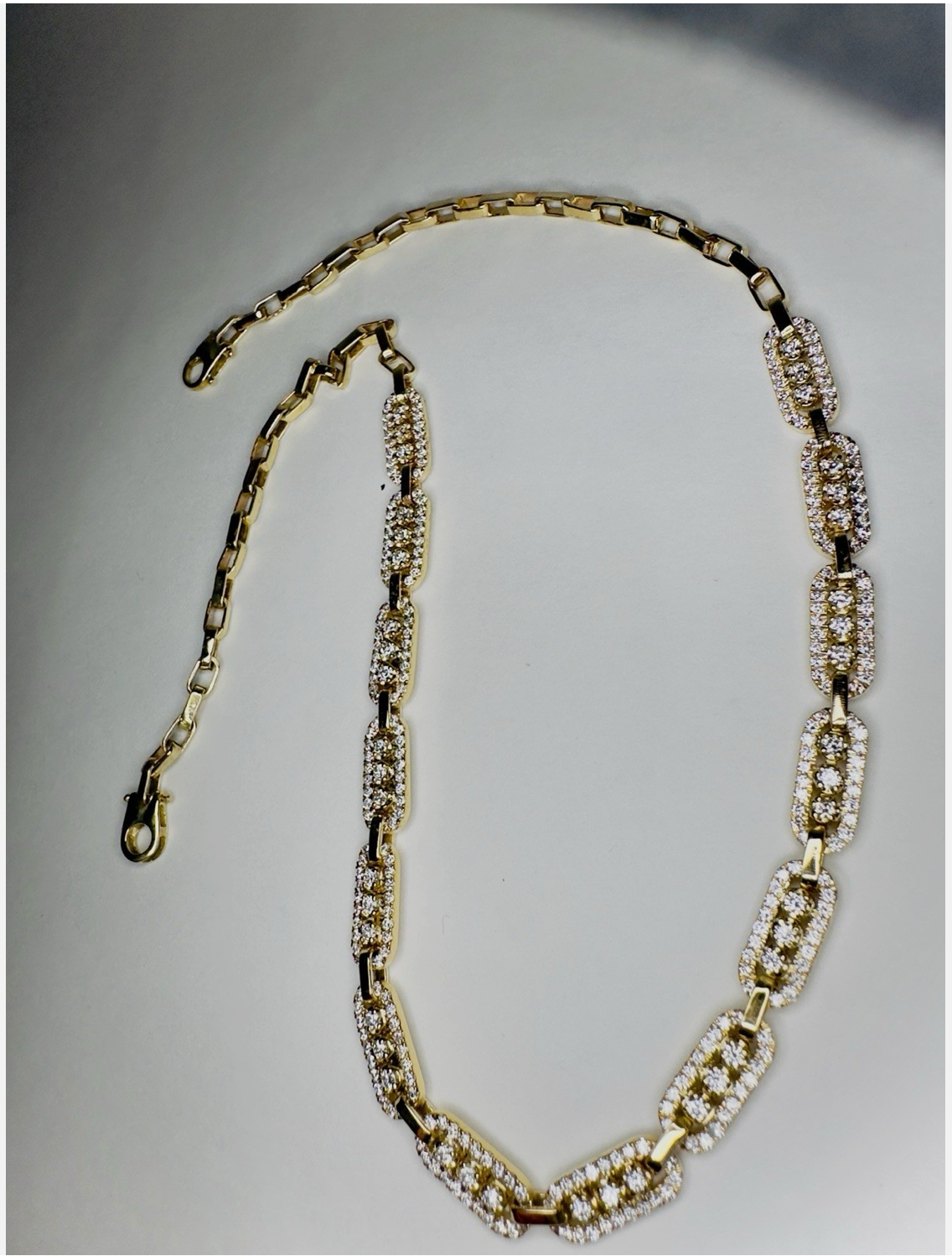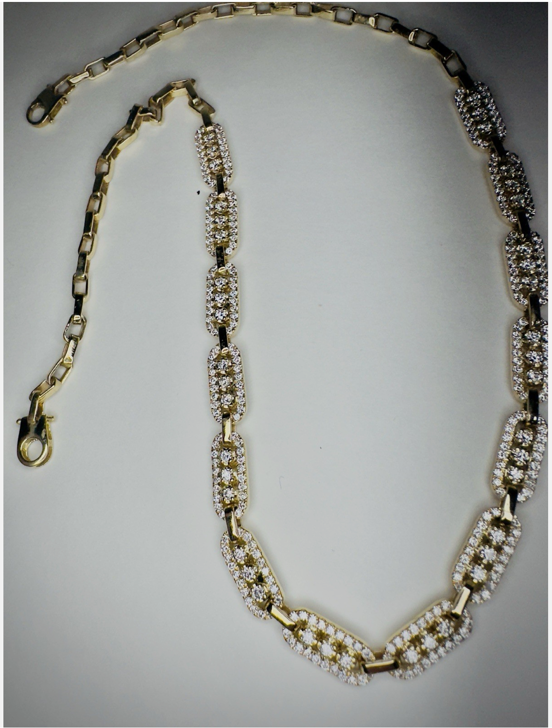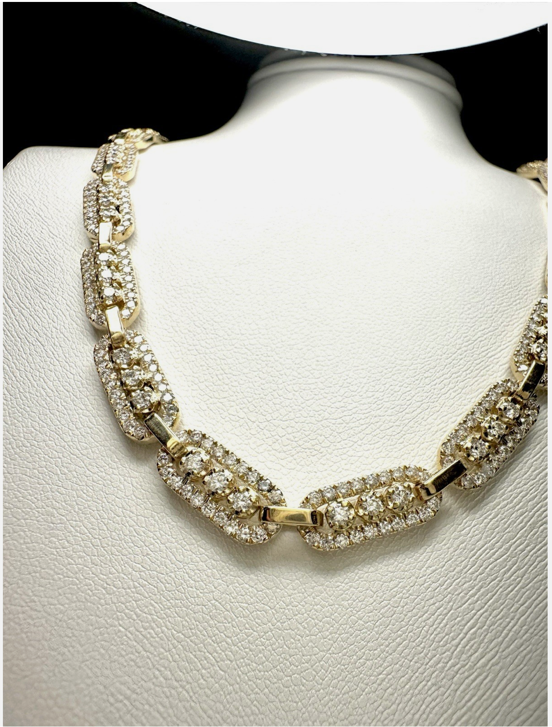 This 14k yellow gold necklace features a bold oval link design, with each link filled with brilliant white diamonds in a pavé setting. The chain is 16 inches in length and finished with a lobster clasp for a secure, elegant fit.